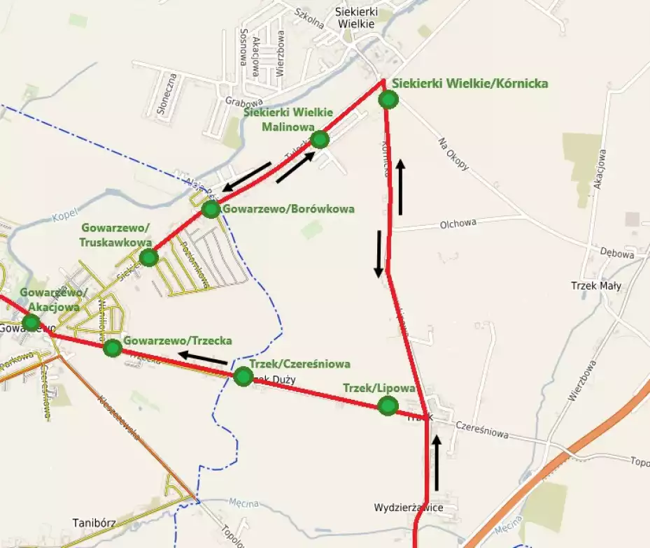 Ze wzglÄ™du na wyłączenie z ruchu części ulicy Siekiereckiej autobus bÄ™dzie poruszaÅ‚ siÄ™ tÄ… ulicÄ… jedynie na odcinku od strony Siekierek, dojeżdżajÄ…c do ulicy Truskawkowej, tutaj dziÄ™ki uprzejmoÅ›ci wÅ‚aÅ›cicieli parkingu przed obiektem handlowym, zawróci i wjedzie (przez Siekierki i Trzek) ponownie do Gowarzewa ulicÄ… TrzeckÄ…, kontynuujÄ…c jazdÄ™ swoim zwykÅ‚ym przebiegiem trasy (bez korzystania z ulicy Waniliowej).
